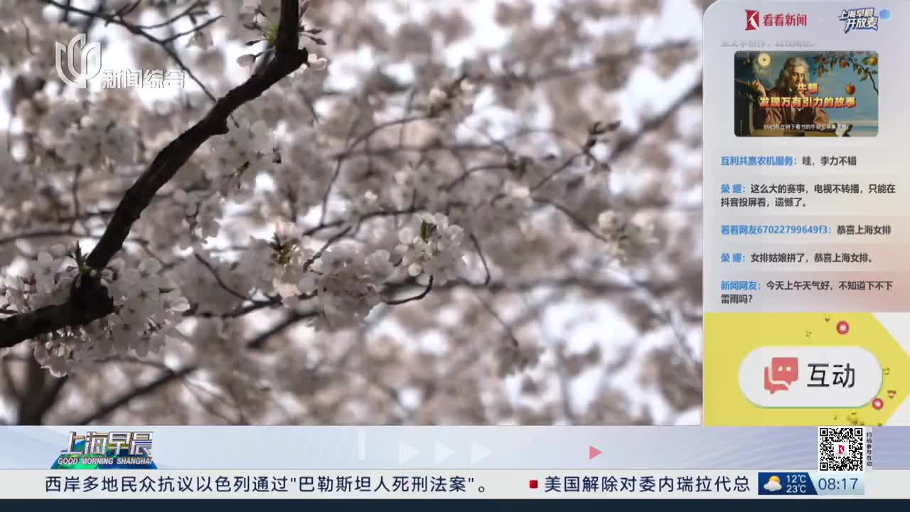 虹口足球场樱花盛放 地铁列车穿越粉色花海