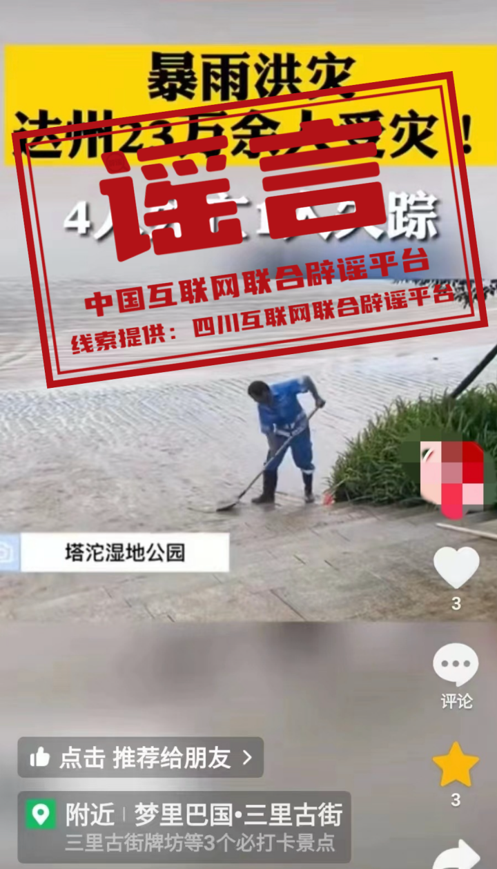 7月10日,网民龙某在某短视频平台发布多篇贴文称:“洪峰过境四川平昌,部分地区受灾严重”。经核实,该内容为不实信息。龙某将四川省巴中市平昌县多年前的汛情旧闻重新拼接合成,编造为平昌县汛情最新动态后发布。(来源:四川互联网举报辟谣平台、四川网警)