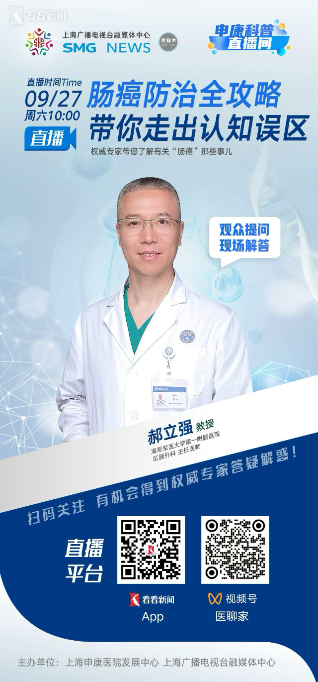 结直肠癌是全球范围内高发的恶性肿瘤之一,近年来在我国呈逐渐上升和年轻化趋势。然而,公众对结直肠癌的认知仍存在诸多误区,例如认为“年纪大才会得”或“没有症状就无需担心”,这些认识往往导致错过最佳预防和早期干预时机。事实上,通过科学的生活方式管理、规范化的筛查以及系统的诊治,可以显著降低结直肠癌的发病率和死亡风险。本期节目中,我们非常荣幸地邀请到了海军军医大学第一附属医院肛肠外科主任医师郝立强教授做客直播间。