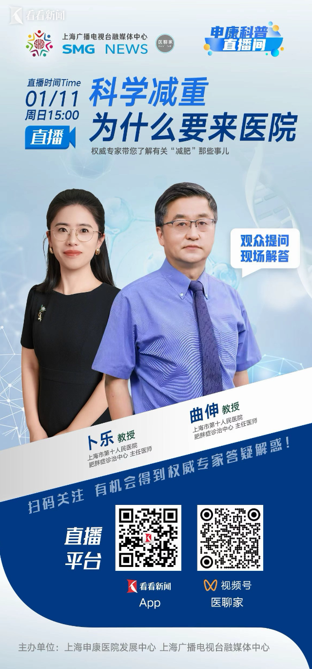 在全民关注体重管理的当下,减重已不再只是审美话题,而是关乎代谢健康、心脑血管风险以及长期生活质量的重要医学问题。盲目节食、网红减肥法、非正规用药,往往短期见效却潜藏巨大健康隐患,甚至可能诱发内分泌紊乱、营养失衡和体重反弹。走进医院进行科学减重,意味着在专业医生的评估下,明确肥胖类型与致病因素,综合运用医学营养、运动干预、药物治疗乃至手术方式,制定个体化、可持续的管理方案。只有在医学框架内进行系统干预,减重才能真正实现“减得下、稳得住、对身体有益”,为长期健康打下坚实基础。本期节目,我们非常荣幸地邀请到上海市第十人民医院肥胖症诊治中心主任医师曲伸教授、上海市第十人民医院肥胖症诊治中心主任医师卜乐教授做客直播间。