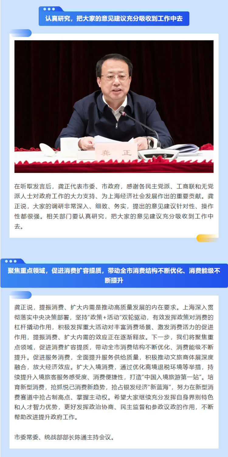 会上,民革市委主委徐毅松、民盟市委主委陈群、民建市委主委解冬、民进市委主委黄震、九三学社市委主委钱锋、台盟市委主委刘艳、市工商联主席寿子琪、农工党市委专职副主委姚捷、致公党市委专职副主委刘新宇、无党派人士代表俞飚分别围绕拓展消费模式和场景、优化消费环境及配套服务、释放消费潜力、扶持实体商业和新兴业态等方面踊跃发言、建言献策。