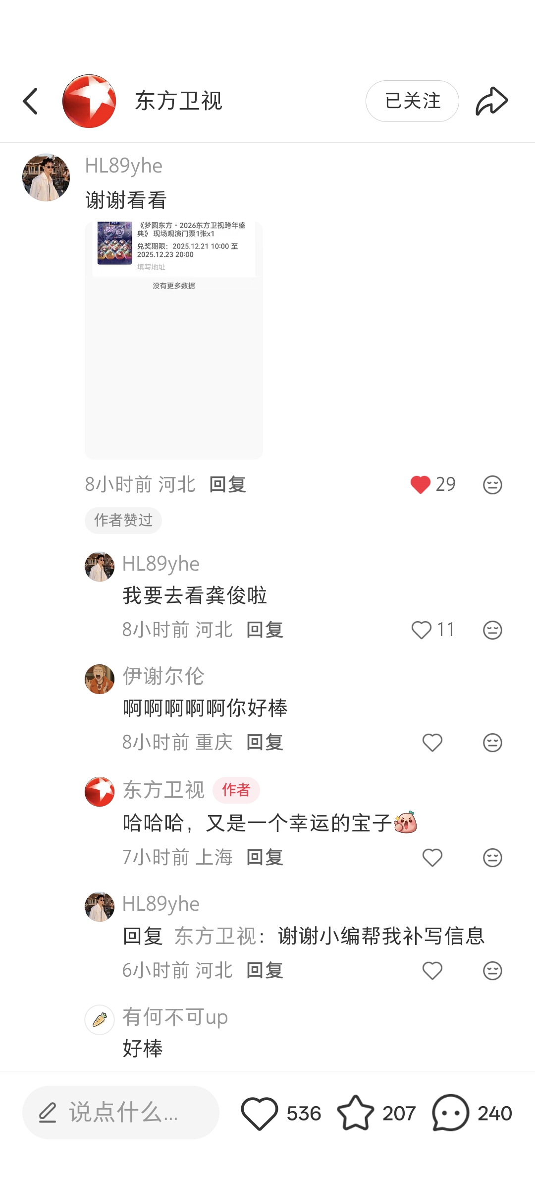 告别2025的最后钟声,即将在上海梅赛德斯奔驰文化中心敲响!2025年12月31日19:30,东方卫视跨年盛典与你相约璀璨之夜,第一批明星已经官宣!包括阿丽娜·扎吉托娃、艾热、蔡程昱 、蔡晓仪 、陈都灵 、陈丽君、陈添祥 、陈卓璇 、邓萃雯、GAI周延 、龚俊、黄渤。第二波阵容也已官宣!包括筷子兄弟、郎朗 、李克勤 、VocalForce力量之声 、林子祥、刘凤瑶 、刘宪华 、刘宇、刘雨昕 、卢昱晓 、毛晓彤 、莫西子诗 、千喆 、任素汐 、商天娥 、申浩男 、谭耀文 、万绮雯 、王安宇。第三波阵容24日揭晓,包括肖战 、靳东、王道铁barry 、王赫野 、王啸坤 、魏子越 、吴汉坤 、辛云来 、许绍洋、颜安、闫桉、叶蒨文、于适、曾辉 、张彬彬 、张洪鸣、张集骏、张康乐、周兴哲。这里有顶级舞台、星光阵容、沉浸视听,更有一份为你准备的现场观演席位!