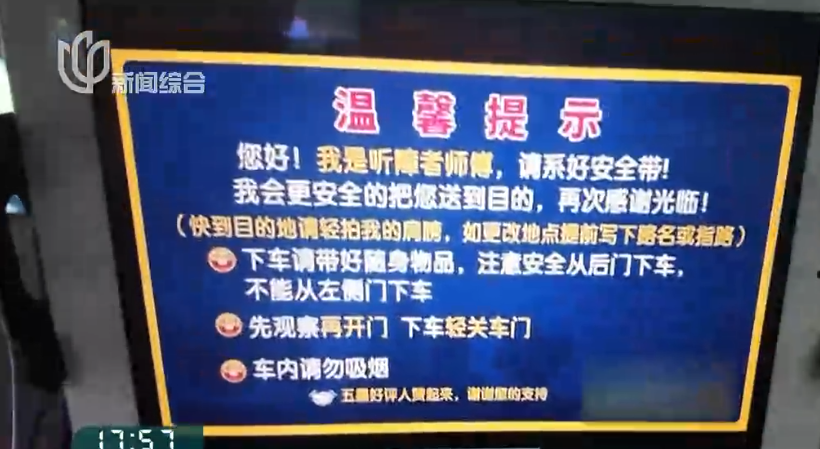 朱师傅佩戴了助听器,车上的屏幕温馨提示:师傅是位听障司机,包括还有一些安全提示。行车中,朱师傅会通过后视镜观察乘客,习惯借助文字或手势交流。