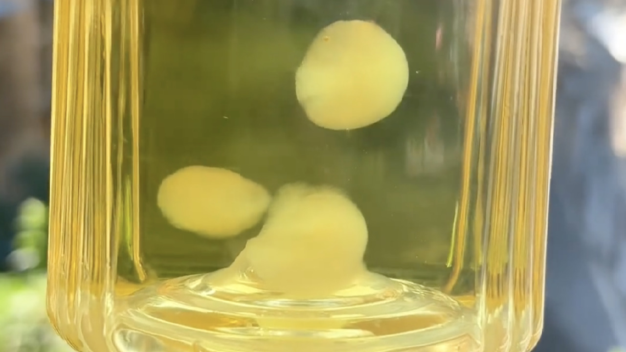 网友上传的图片显示,这些“茶菌”呈现白色或半透明团状,最大的可以达到乒乓球大小。