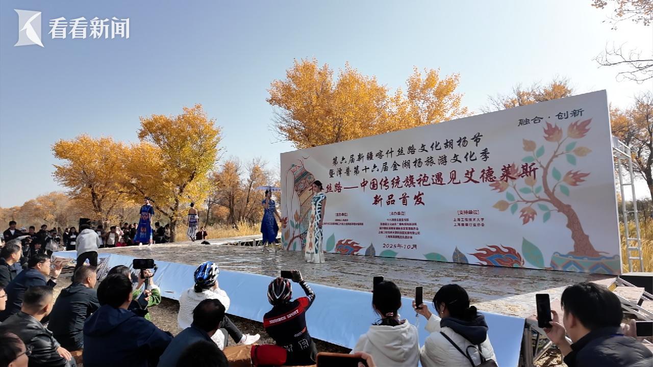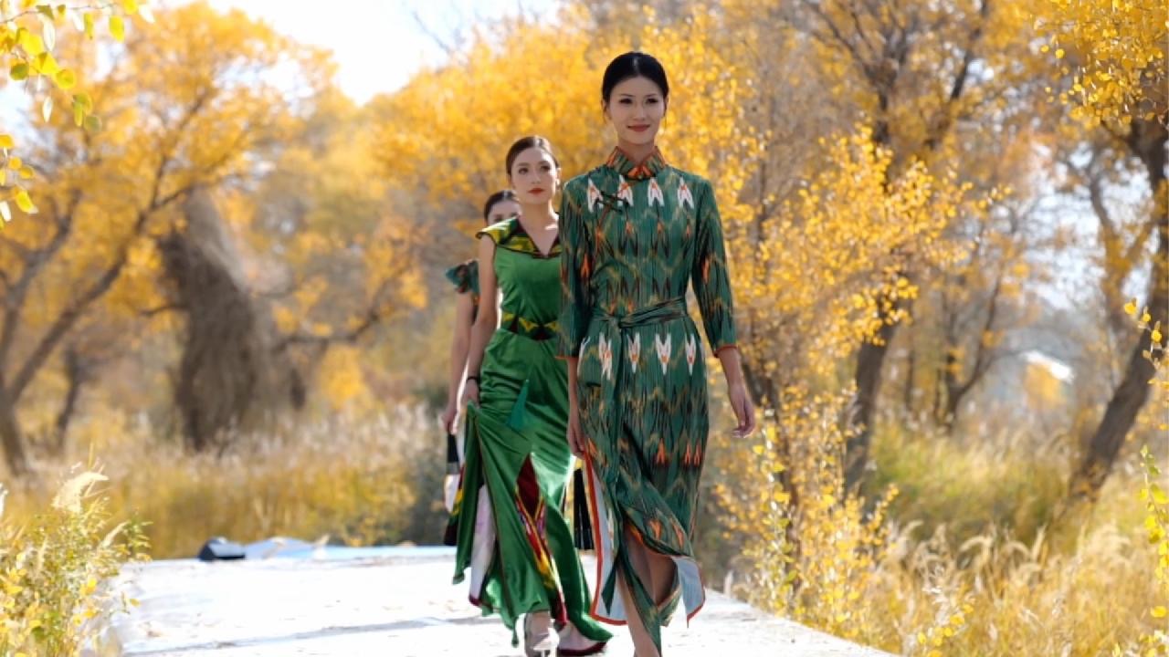 在“千年丝路——中国传统旗袍遇见艾德莱斯新品首发”仪式中,金色胡杨成为天然背景,映衬出海派旗袍与艾德莱斯绸交织的时尚风采。来自上海的设计师将艾德莱斯绸这一非遗技艺,巧妙融入海派旗袍的立领、对襟、斜襟等细节,展现出传统与现代的完美融合。
