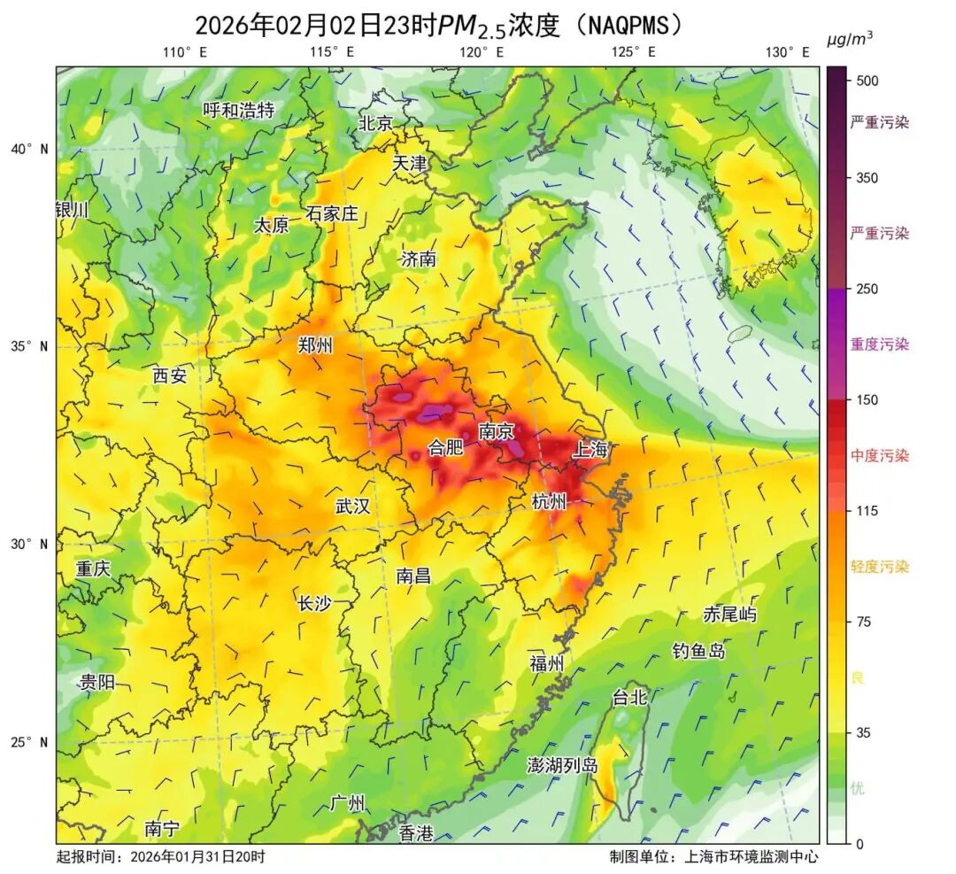 2日8时、23时及5日8时、6日8时PM2.5浓度预报结果