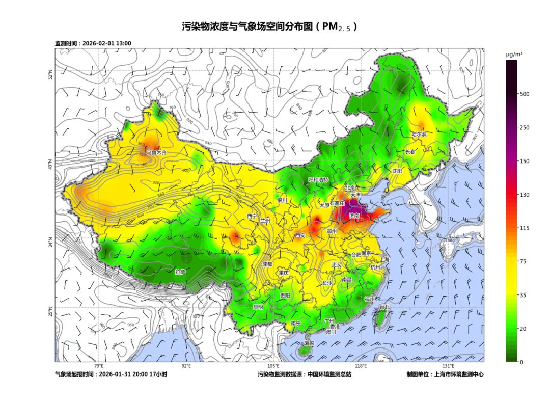 2月1日13时全国PM2.5浓度空间分布