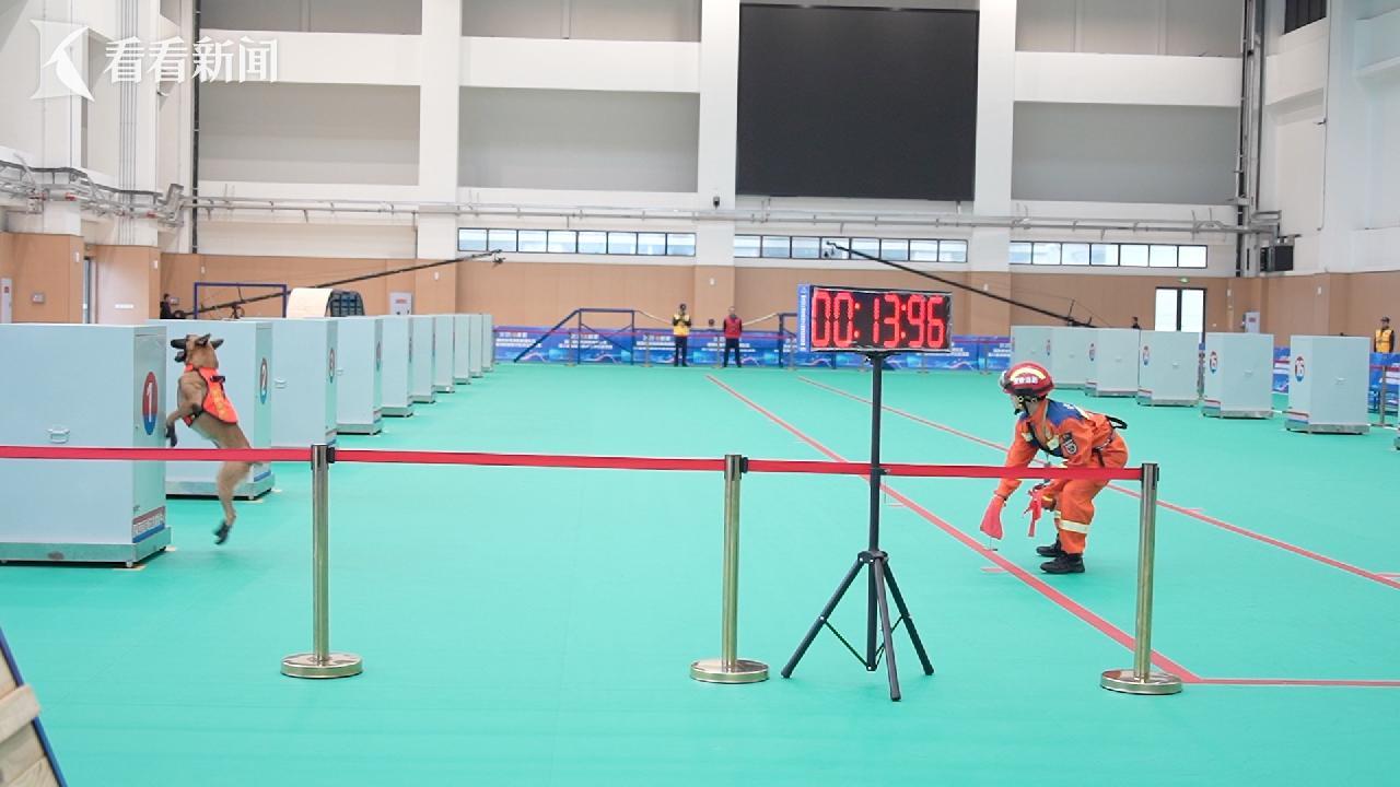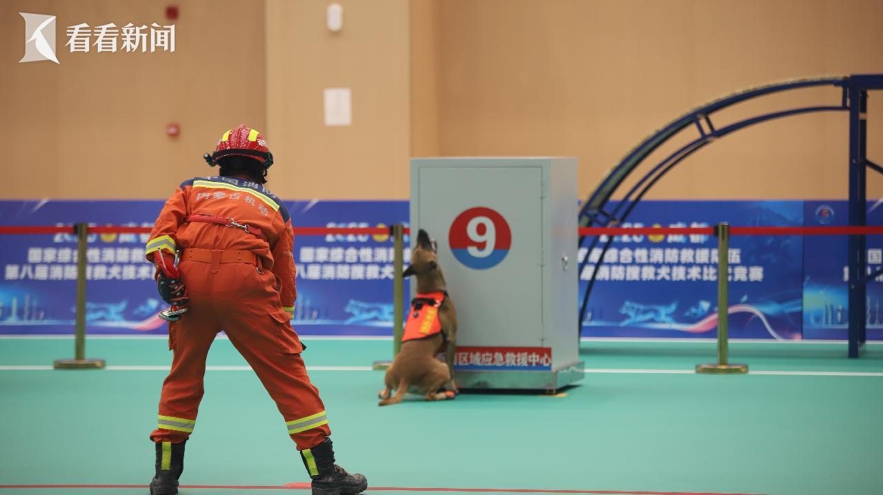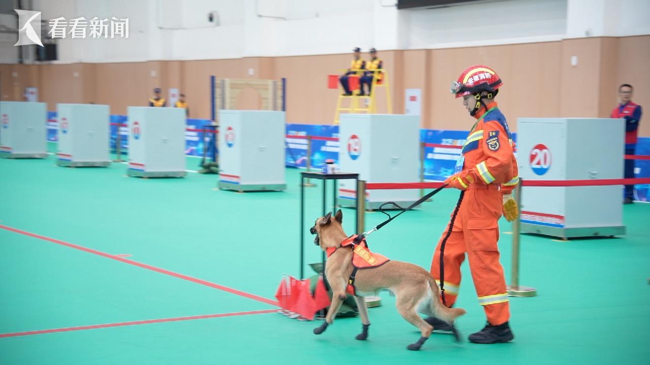 在国家西南区域应急救援中心室内训练场内,传来了阵阵狗吠声。国家综合性消防救援队伍第八届消防搜救犬技术比武竞赛今天上午迎来首个比赛日,率先开赛的箱体搜救科目极具观赏性与挑战性:参赛搜救犬需要先快速穿越独木桥、跳桩、栅栏等障碍,再从20个均匀排布的箱体中,精准识别出藏有人员的5个箱子,全程既要保证速度,又要克服食物、玩具等干扰物的影响。据国家消防救援局特种救援司高级工程师熊伟介绍,参赛犬训导员如果发现搜救犬在第一轮搜救过后,没有发现相应数量的被困人员,则会要求搜救犬再进行第二轮精细的搜救,直至找到所有被困人员。最终,技术规范用时短者获胜。