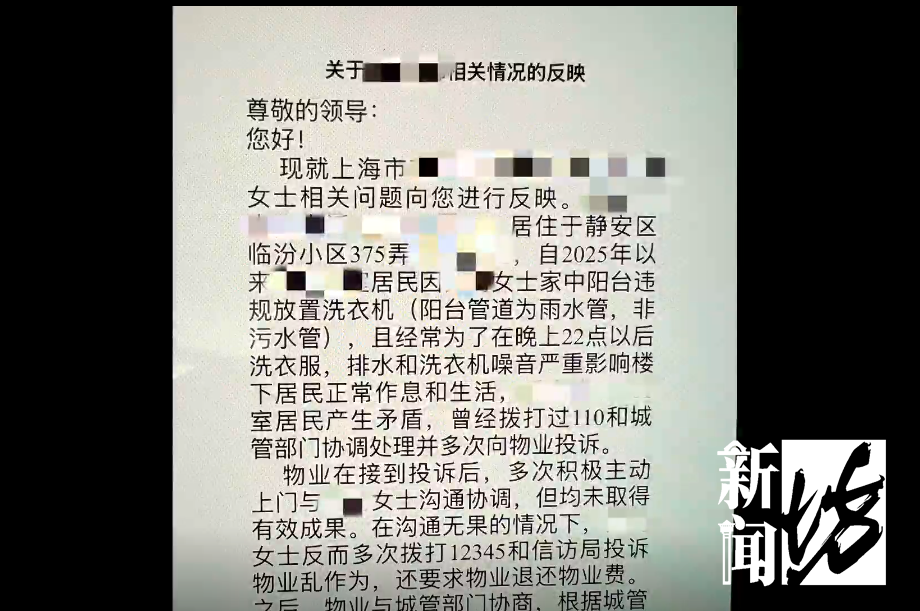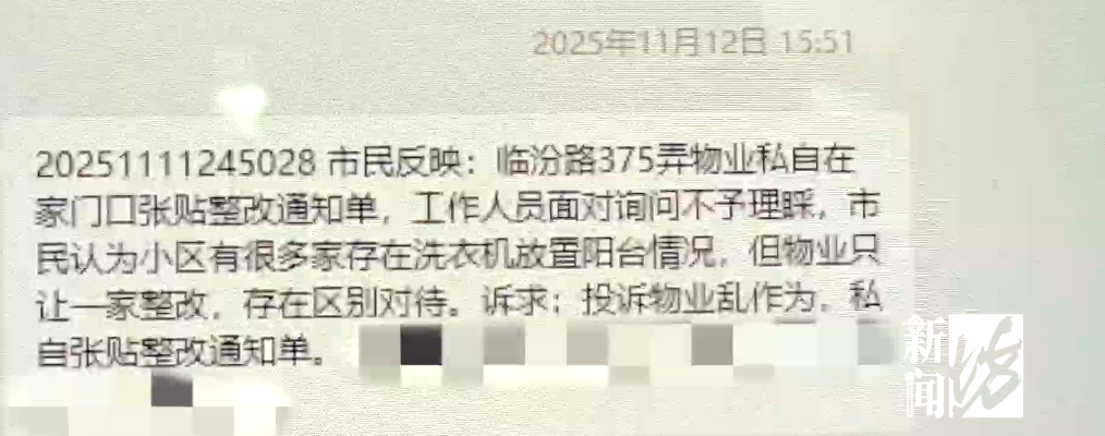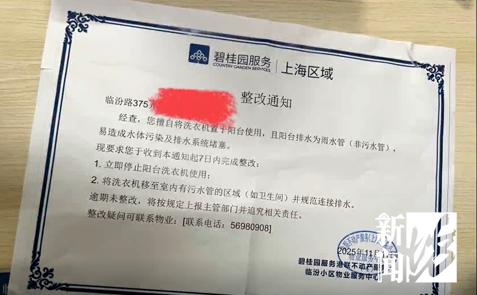 9月28号的晚上,我开了洗衣机洗衣服,3楼的人就说洗衣机有落水管的声音,后来通过了城管调解说是因为房子老龄化了,洗也可以洗,但是十点半之前结束,我说这完全没有问题。第二天我下班回家,就发现门口(物业)贴了一张整改单,要求我把洗衣机挪位移掉。