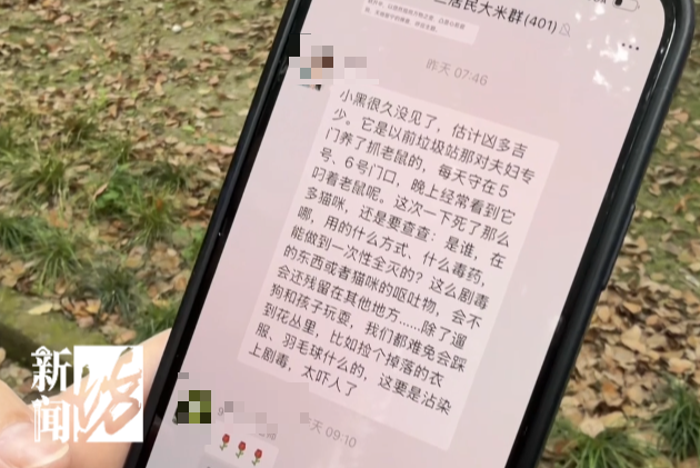 据姜女士介绍,在一个有400人的小区群聊中,每天都在讨论猫咪的死亡,“家里的小孩老人都不敢去,小区里散步,遛狗的也不来了。楼上掉下的衣服都不敢去草地上捡,小孩踢皮球扔到草地里都说不要捡了。”