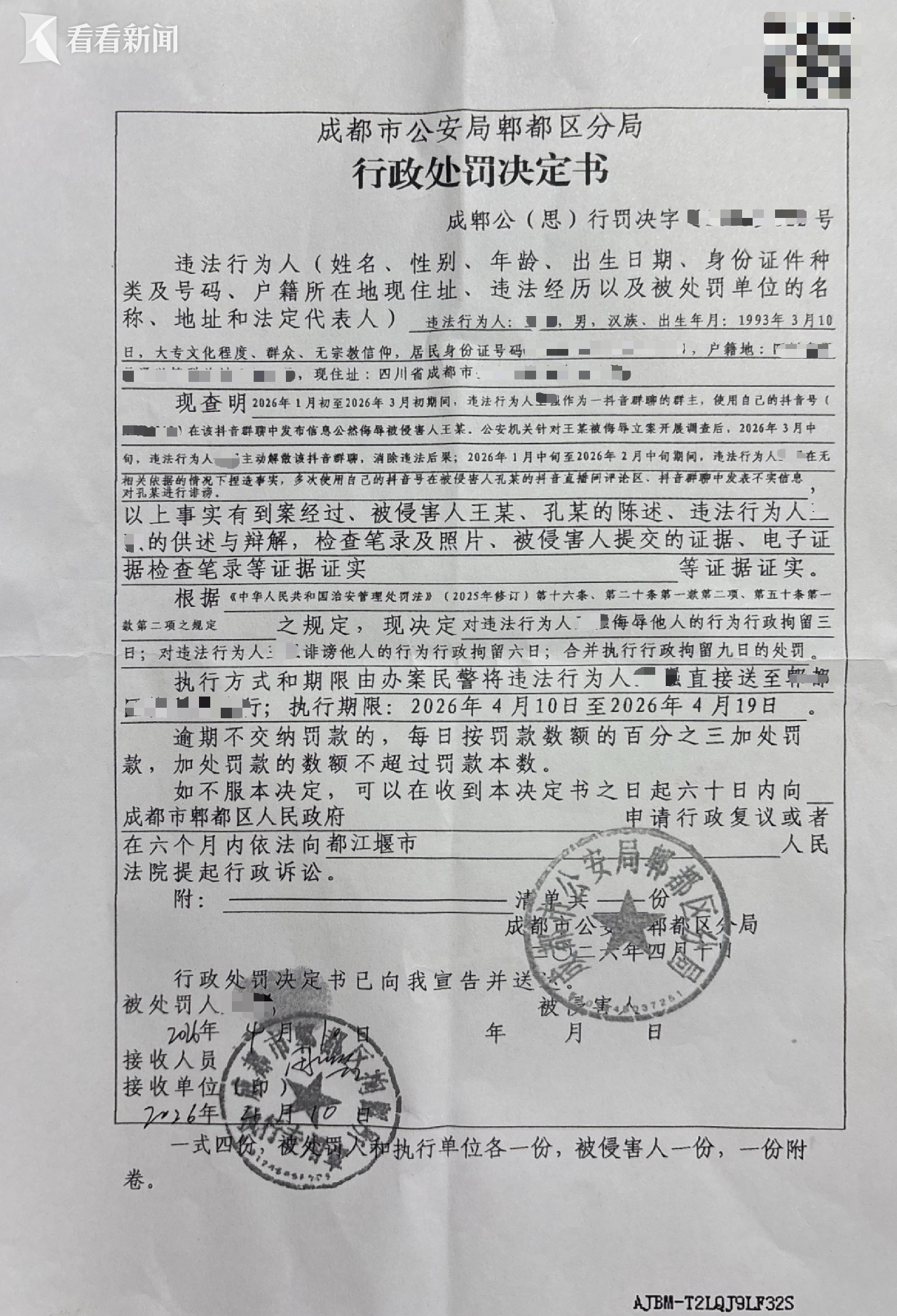 公安机关经全面调查,结合王某的供述与辩解、被害人陈述、电子证据、检查笔录等多项证据,依据《中华人民共和国治安管理处罚法》(2025年修订)相关规定,决定对王某侮辱他人的行为处以行政拘留三日,对诽谤他人的行为处以行政拘留六日,合并执行行政拘留九日,执行期限为2026年4月10日至4月19日,由办案民警直接送郫都区拘留所执行。
