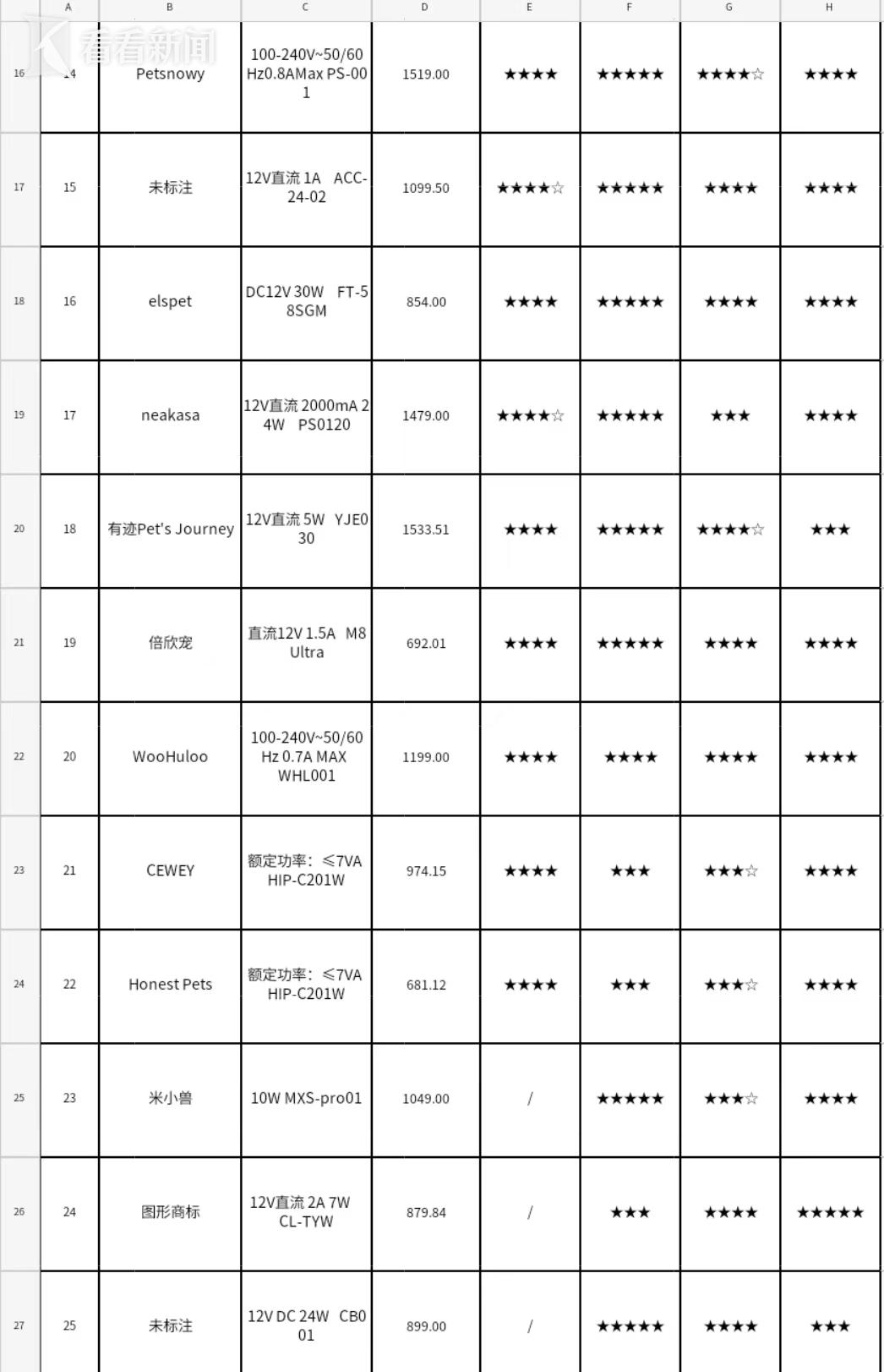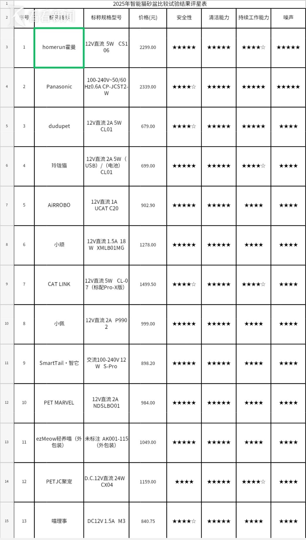 最后给大家附上上海市消保委对于测试的25款智能猫砂盆比较试验结果评星表: