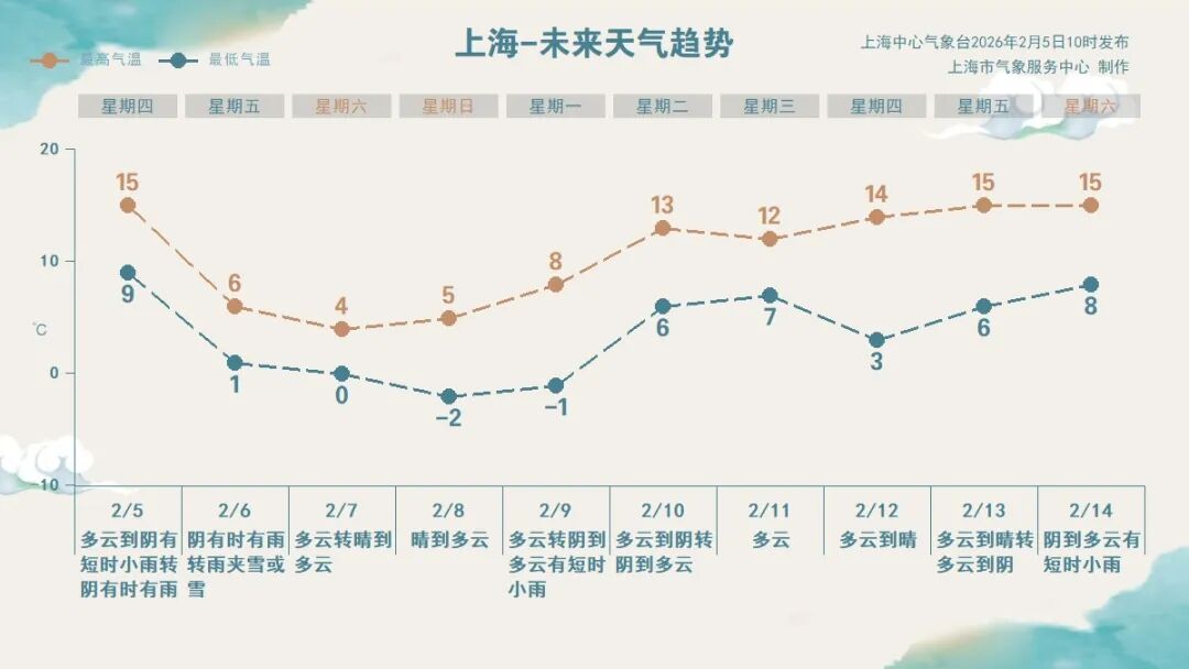 双休日上海天气晴冷,市区极端最低气温在-2℃,郊区在-7~-5℃,将可能刷出入冬以来气温新低。下周上海为“两头阴雨中间晴”的天气,气温整体有所回升,周中后期最高气温在12~15℃之间。