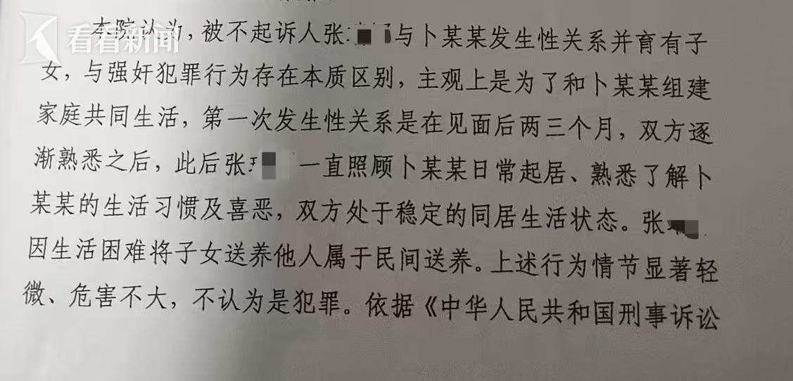 不过,在2025年10月,和顺县人民检察院认为张某军与卜某发生关系并育有子女,与强奸犯罪行为存在本质区别,主观上是为了和卜某组建家庭共同生活,因此做出不予起诉的决定。