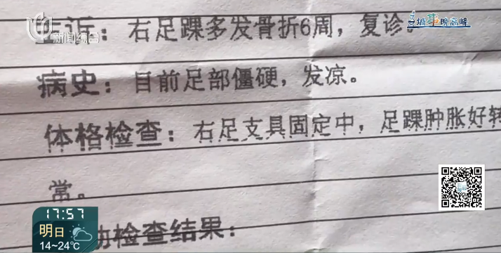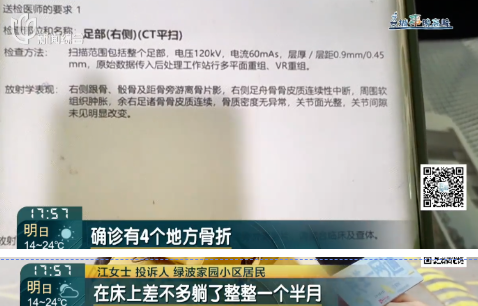江女士说,事发后没几天,物业工作人员曾上门探望,让她先安心养伤,等治好了再谈后续的事。然而,等她能正常行走后再次找到物业时,对方的态度却完全变了。对方称这个事他们不管了,并且否认作出的承诺。