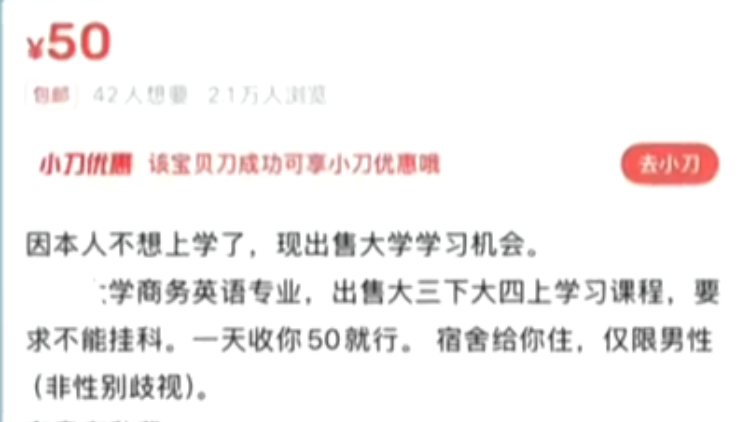 在某二手平台上,IP地址显示在珠海的一位网友发帖,转让一个特殊的东西。标题是“因本人不想上学了,现出售大学学习机会”。详情页显示教学形式为线下授课,计价方式是每次50元。信息中,还特别强调“虽然证书是我的,但知识学到就是赚到”。同样的帖子,发帖的IP,覆盖广东、山东、内蒙古、吉林、福建、江苏、湖南等地。配图几乎都是大学校门照片, 价格多是按天算,40元、50元到100元一天不等。单条贴文浏览量最高2.1万。