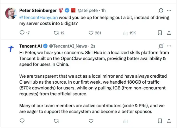 没想到,争议随之而来。OpenClaw创始人彼得·斯坦伯格在社交媒体上公开抱怨说,腾讯先抓取其社区ClawHub上的技能数据,再导入腾讯本土化平台SkillHub,这是一种“照搬抄袭”行为。