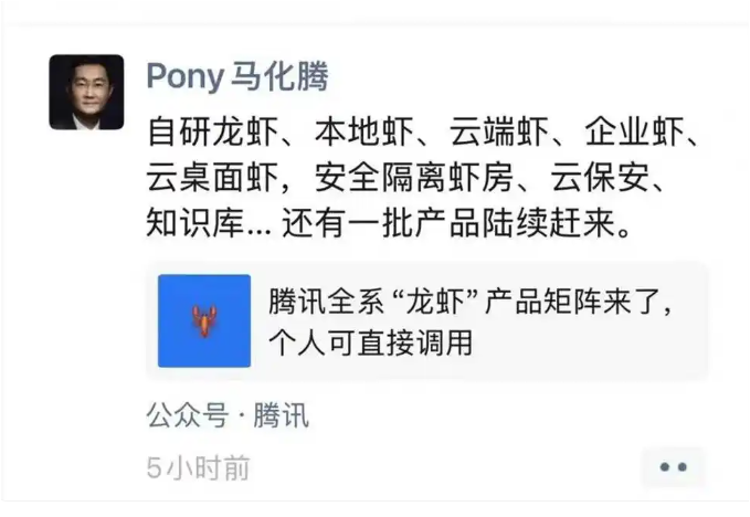 从腾讯CEO马化腾在朋友圈的官宣文案来看,其“龙虾”产品已构成庞大矩阵:从自研龙虾到本地部署、从云端服务到企业级应用、云桌面集成,再到安全隔离的“虾房”与“云保安”,一系列代表新业务的名词令人目不暇接。