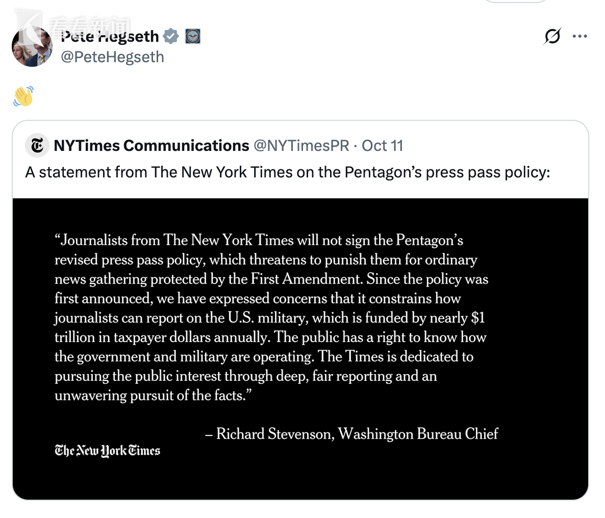 面对各家媒体的反应,美国防部长赫格塞思在社交媒体上以“挥手告别”的表情符号作出回应。