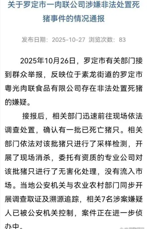 昨天,当地证实了事件并披露关键处置进展。目前,相关部门依法对该批猪只进行了采样检测,开展了现场消杀,委托有资质的专业公司对该批猪只进行了无害化处理,死猪没有流入市场。当地公安机关与农业农村部门同步开展调查取证及溯源追踪,相关7名涉案嫌疑人已被公安机关控制,案件正在进一步侦办中。