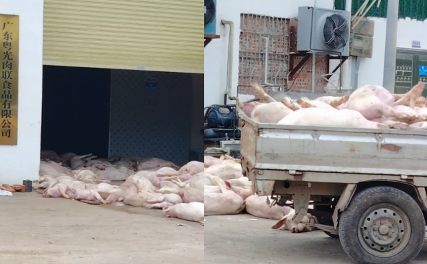 近日,广东罗定一肉联企业门口堆放大量死猪的事件引发全网关注。网友发布的视频显示,涉事企业卷帘门旁及一辆运输车上,死猪露天堆积且延伸至厂区内部,画面触目惊心。