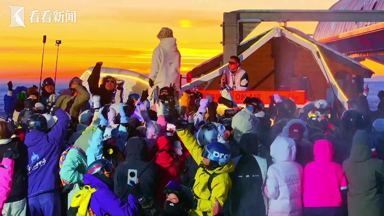 近日,在新疆阿勒泰市将军山国际滑雪度假区山顶,傍晚的暖调霞光铺满雪道。夕阳下,众多滑雪爱好者齐聚于此,随着音乐尽情摇摆,拍照“打卡”定格美好瞬间。