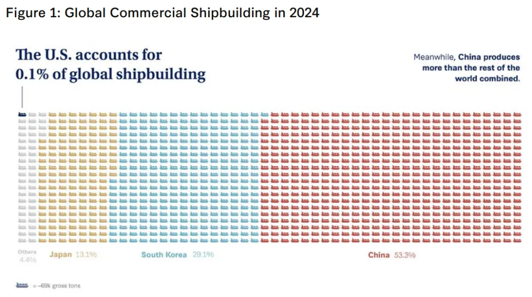 80年后的今天,全球商用船舶建造中,中国份额超过一半(53.39%),韩国(29.1%)、日本(13.1%)分列二三位,而美国造船只占全球份额的0.1%。