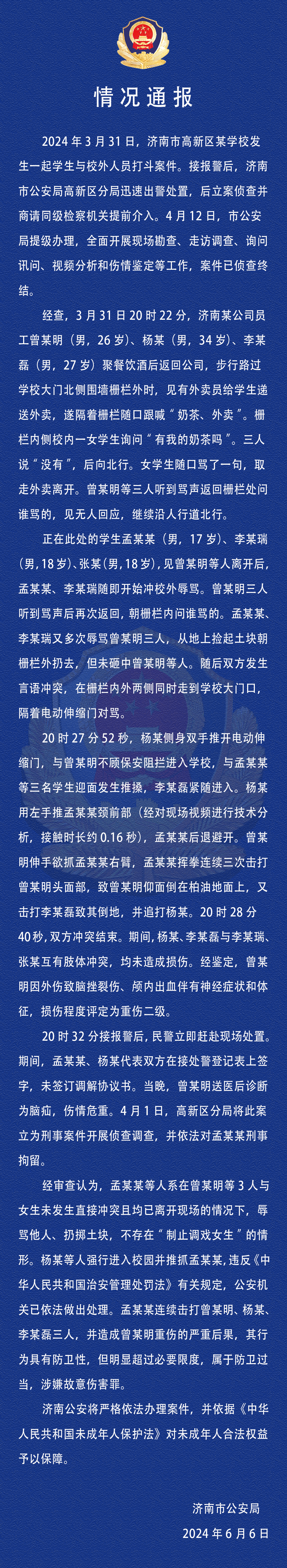 6月6日,济南公安就济南市高新区某学校发生一起学生与校外人员打斗案件发布警情通报: