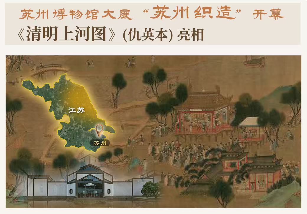 《清明上河图》,北宋张择端的原作立足凄清萧瑟的清明时节,明代仇英本则淡化了季节,以青绿设色,色彩氛围热闹又浓烈;张择端暗指汴京复杂的社会矛盾乃至社会危机,仇英则着意渲染苏州商事兴隆百姓安居乐业的繁华。值建馆20周年之际,苏州博物馆春季档开年大展“苏州织造”开幕,辽宁省博物馆藏《清明上河图》(仇英本)时隔十年再次“返乡”,与各地游客见面,同苏州观众“叙旧”。