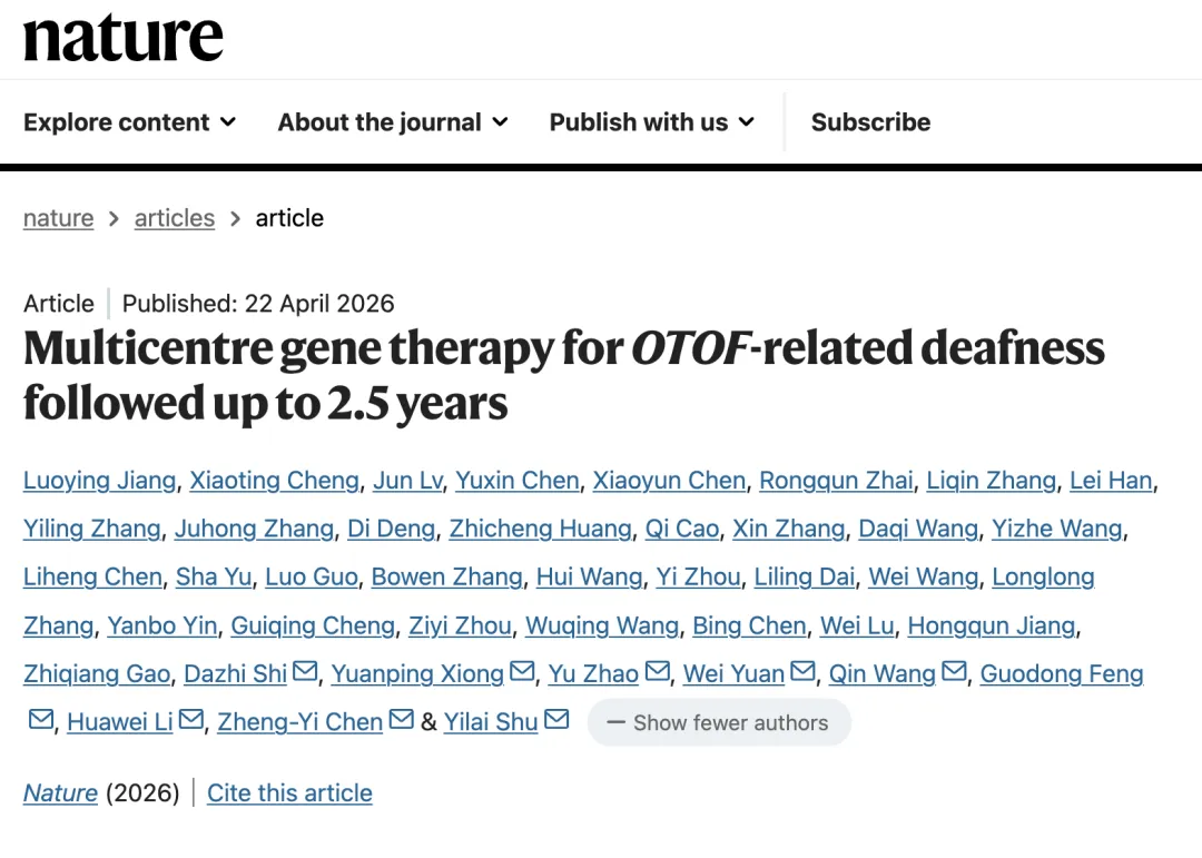 北京时间4月22日晚,复旦大学附属眼耳鼻喉科医院舒易来教授领衔的先天性耳聋基因治疗多中心临床研究在《自然》(Nature)杂志在线发表。
