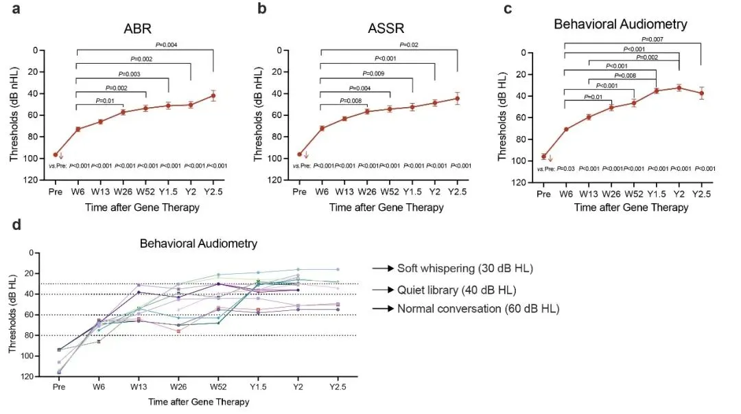 临床数据交出了一份亮眼答卷,整体治疗有效率达90%,患者听力水平呈现持续稳定上升趋势。核心听力指标改善显著,患者听觉脑干反应(ABR)平均阈值从给药前的>97 dB nHL,提升至随访2.5年时的42 dB nHL;多频稳态诱发电位(ASSR)阈值从>96 dB nHL,改善至44 dB nHL;行为测听阈值从>96 dB HL,优化至37 dB HL。“随访达2.5年的有效患者中,100%能听清日常交谈,57%能捕捉图书馆级别的轻微背景音,43%能听见耳语。”团队成员、眼耳鼻喉科医院耳鼻喉科博士生蒋罗颖说。