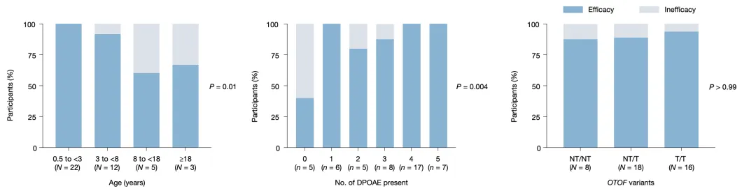 团队还首次锁定三大影响疗效的关键因素,为精准施治提供科学依据。一是年龄,0.5至3岁低龄患儿治疗有效率达100%,未成年患者获益更显著;二是畸变产物耳声发射(DPOAE),作为评估耳蜗外毛细胞功能的重要指标,给药前在更多频率引出DPOAE反应的患者,治疗后听力恢复效果更好;三是基因突变类型,它会影响行为学测听阈值的恢复程度,但不影响治疗是否有效。相关发现为临床选择合适患者、制定个性化方案提供了依据。
