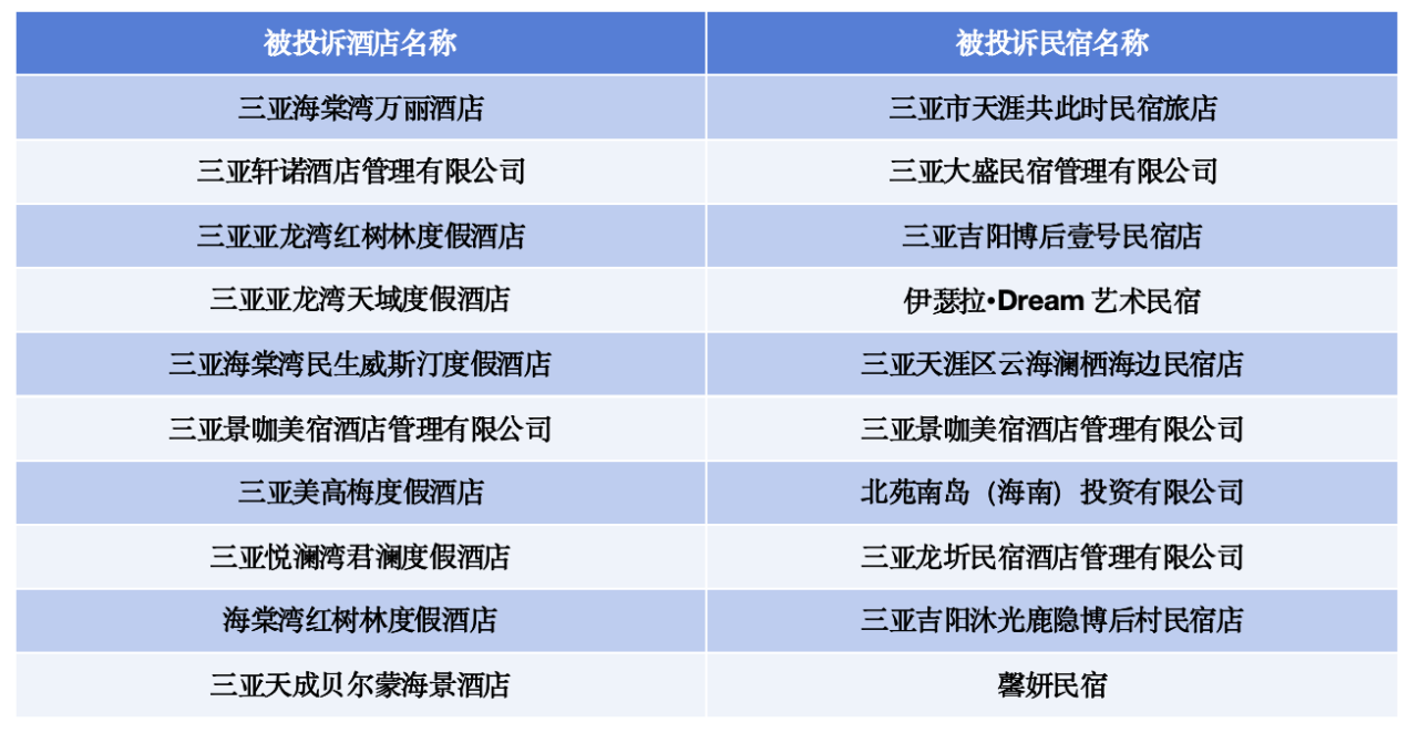 根据海南省住宿单位涉诉情况统计,2026年2月1日至2026年2月13日,海南省投诉量排名前十的住宿单位(酒店、民宿排名分列)。本期上榜住宿单位收到的投诉问题主要集中在:服务态度不佳、服务质量不达标、虚假宣传、未明码标价、诱导消费、合同违约等方面。