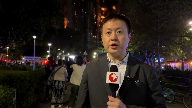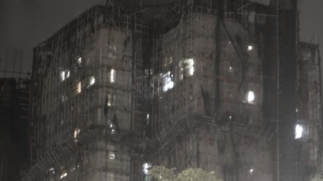 救援人员用临时照明 通宵在宏福苑火灾楼内调查