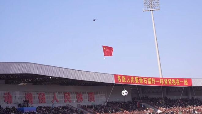“喀什杯”无人机挂国旗巡场 观众欢呼声响彻全场