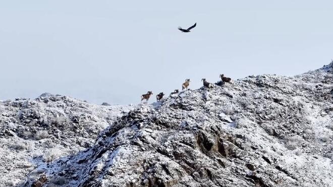 石油城邂逅雪山来客 成群盘羊来“串门”