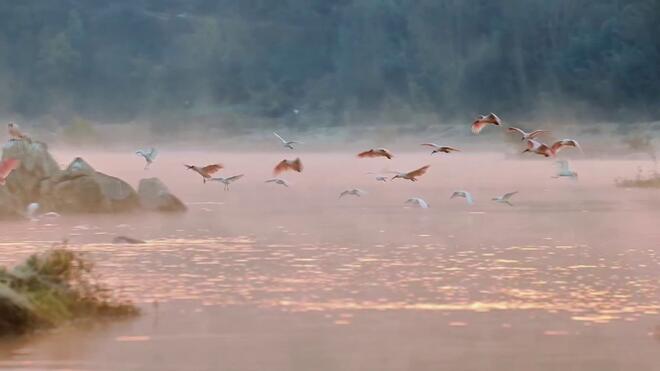 “鸟中精灵”朱鹮晨雾中翩翩起舞