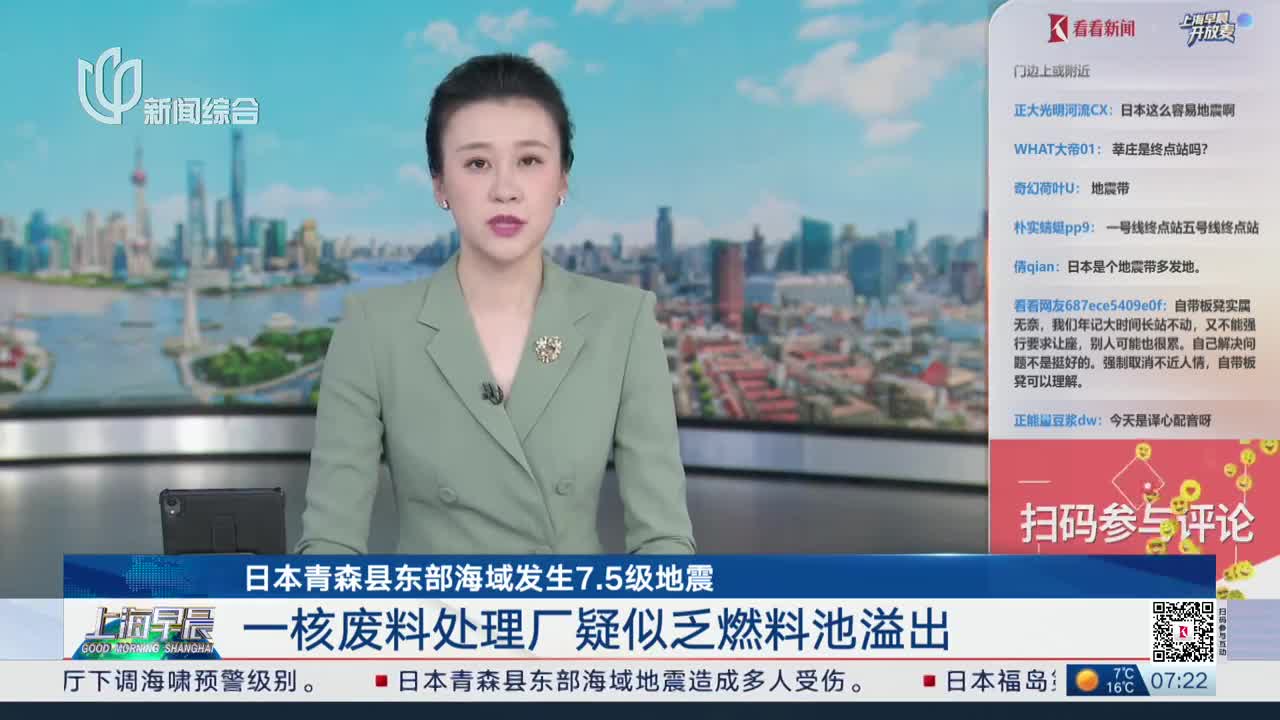 00:46 日本青森县东部海域发生7.5级地震 一核废料处理厂疑似乏燃料池溢出