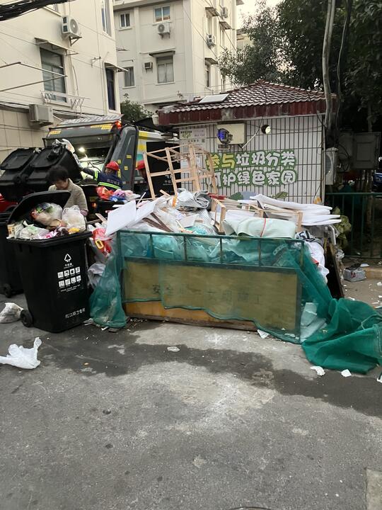 虹口区广中街道商业一村小区垃圾厢房旁随意设置露天垃圾堆点,建筑垃圾、生活垃圾混放,经常堆积如山,虫蝇成群,扬灰满天。垃圾厢房保洁人员利用工作时间谋取私利,大量时间用来回收周边垃圾买钱,把小区当作垃圾回收站,在小区公共区域分拣囤积垃圾,其行为不仅影响小区环境,所囤积的垃圾中有大量易燃泡沫箱,火灾隐患巨大。 反映到街道、居委、物业长达一年得不到解决。本就老旧小区,居住条件差,周边居民长期无法开窗、无法正常凉衣晒被,生活苦不堪言,投诉无门,望媒体能予以关注解决。