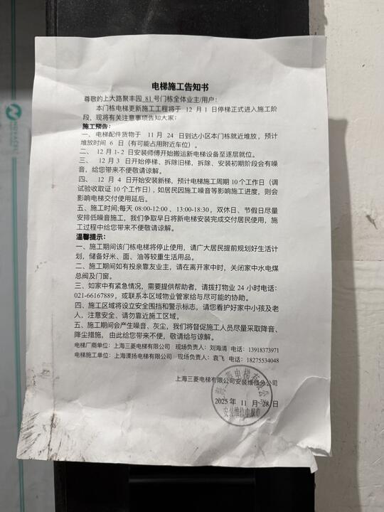 小区楼栋(一共11层)电梯停运一个多月,没有按照张贴的时间计划进行,电梯安装完成后,迟迟不验收,故无法使用,严重影响楼栋内老年居民的出行,且已经多次与物业沟通未果,物业给不出恢复运营的时间表,一等再等,忍无可忍,请求媒体介入,帮我们解决问题,感谢!