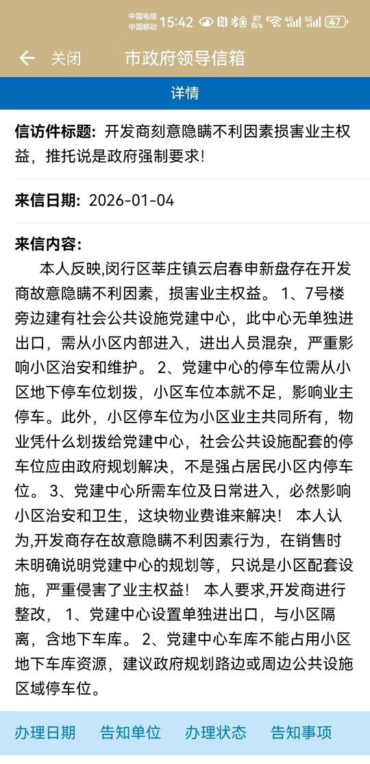 闵行区秀涟路77弄20号中企云启春申在7栋楼下规划设置32个政府配套专用车位,该事项从未向业主公示告知。目前规划车位直接围堵7栋业主入户门,导致7栋业主完全无法购买、使用本楼地下车库车位。此举严重侵害本栋楼业主权益。 不少业主已经向12345、市政府领导信箱进行投诉反馈,但至今未得到明确满意的解决方案。业主多次要求与开发商协商,但是开发商拒不接受面谈。