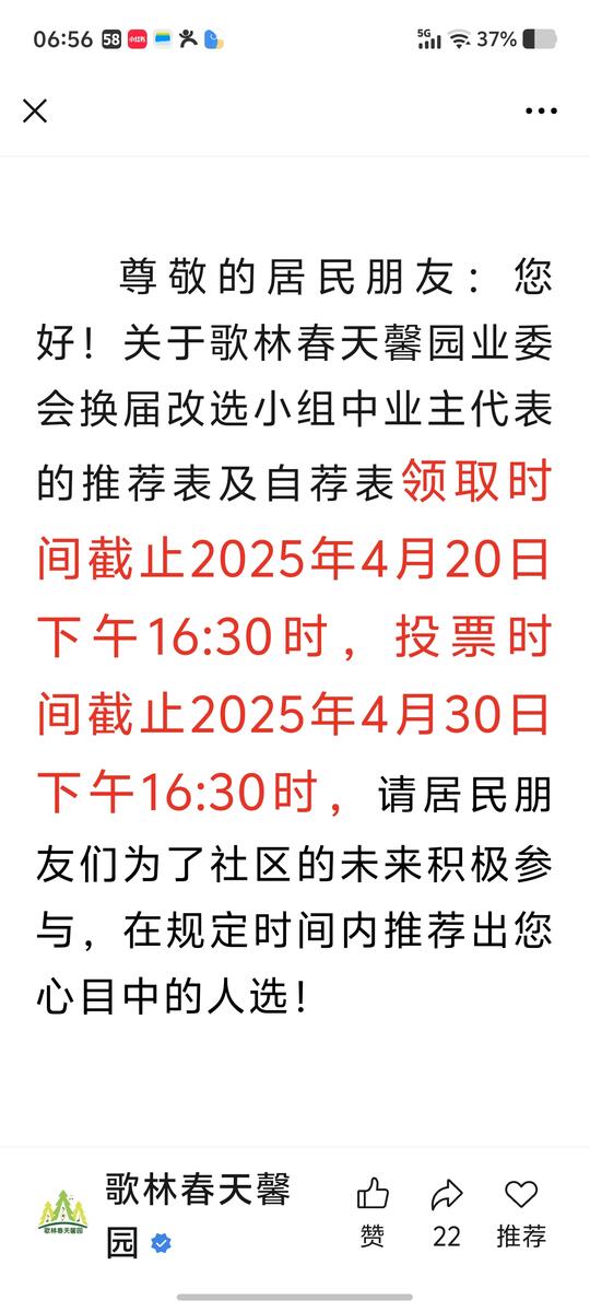 上海市静安区歌林春天小区换届业委改选,居委会擅自把我们业主选出的615高票人员,用一票的古稀老人做替换,而投票入箱是2025年4月30号截止,却在2025年的6月20号却发出了投票规则公示,真是滑天下之大稽,朗朗乾坤既然在上海滩发生这么一件诡异事件,我们小区业主都义愤填膺,现在就让缪锦国和有关领导出面给我们一个正面的答复,以解业主心中的疑惑!