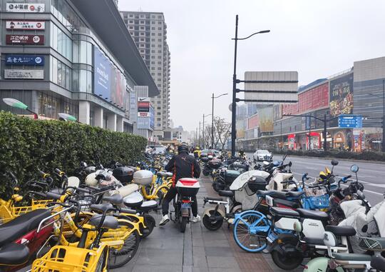2026年1月17日下午路经天山路天山商厦,人行道上停泊的非机动机辆太多了,还经常有骑行者在车堆里穿越,行人走路有点难。
