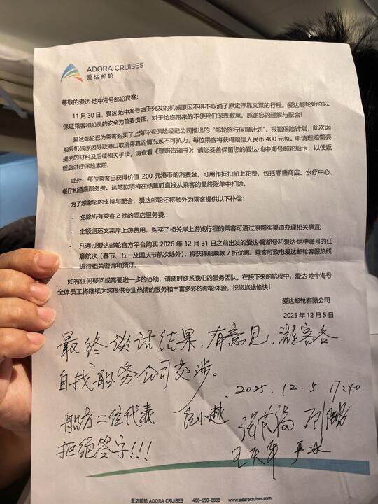 去年11月25日,我和朋友8人乘坐爱达地中海号邮轮前往东南亚5国(菲律宾、马来西亚、文莱、新加坡、越南)13天游。途中船方在毫无症状的情况下突然称由于机械故障而取消了文莱的行程。在善后处理中,船方未作任何的说明和出具航海日誌、维修保养记录。至今对游客要求退还港务费一事不予理睬。