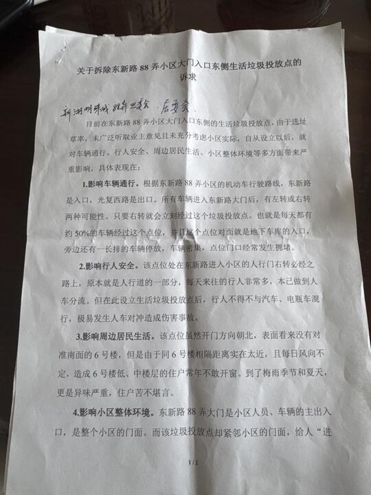 我是东新路88弄6号楼居民,因6号楼门口违建搭了一只垃圾箱,长期影响6号楼居民的生活和质量,我们于2024年3月2日向业委会及居委提交要求拆除东新路88弄小区大门入口东侧生活垃圾投放点的拆求,6号楼栋的9 0多户业主的签名认可。业委会和居委会沟通一致同意垃圾房迁址,于2024年3月12日发回复函于我们6号楼居民,但至令为止,垃圾箱还未迁址,我们不知什么原因,请新闻坊给予我们支持,谢谢