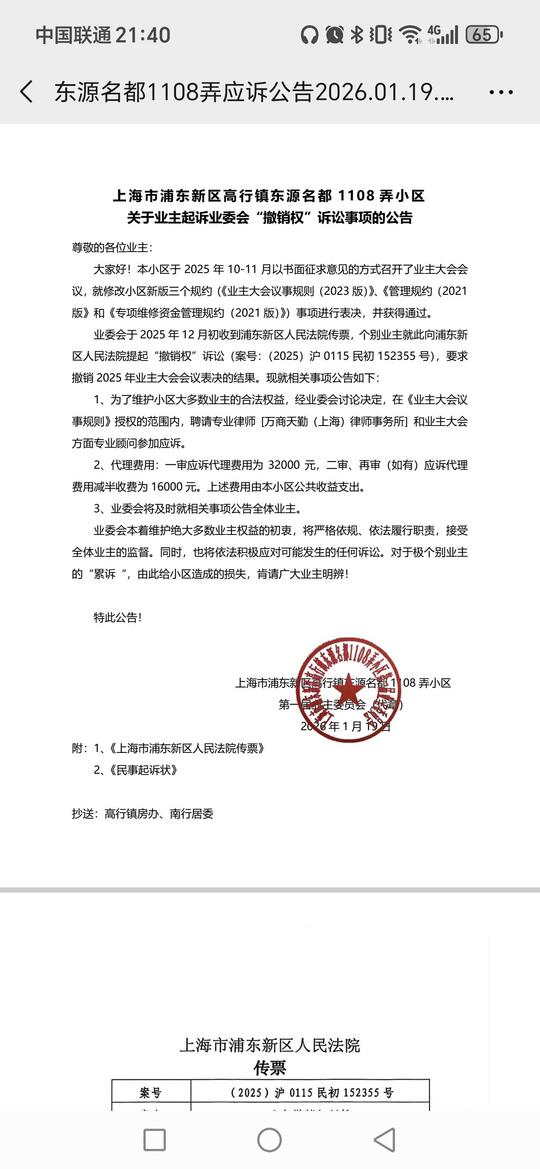 双桥路1108弄业委会未经全体业主同意私自动用小区公共收益聘请律师和业主们就不合理的业主规约(如动用维修基金无需业主同意等)对簿公堂。