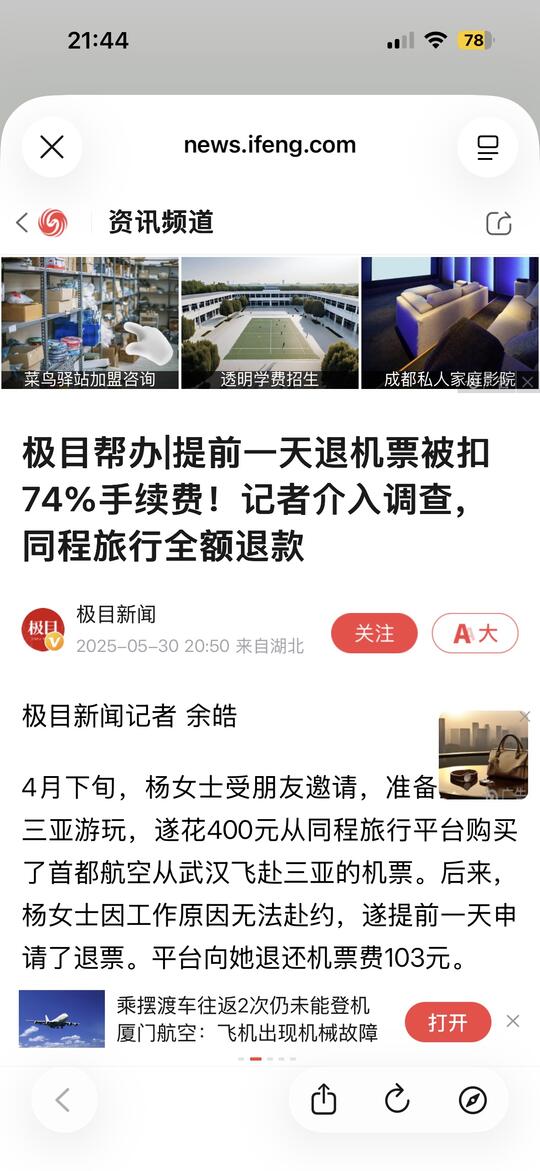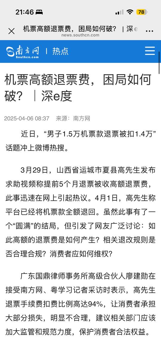 事实经过:我于【2026年2月1日】在同程App购买4张上海-澳门往返机票,因行程变化,我立即在【2026年2月3日】起飞前38天申请退票遭遇高额扣费平台在未告知具体依据的情况下,强行扣除每张票800元,总计3200元的“手续费”。 1. 收费不合理,涉嫌违反规定 我要求同程平台出示该笔手续费对应的、已向中国东方航空支付且不可退还的“实际损失”凭证。对方无法提供,证明其收费无依据。 2.内部沟通拖延,解决无望 发现问题后,我多次与同程客服沟通,对方均无法给出合理解释,仅拖延,侵犯了消费者的合法权益。 3.平台响应存在双重标准,外部监督是有效解决途径 有权威媒体介入调查平台方往往能够迅速响应