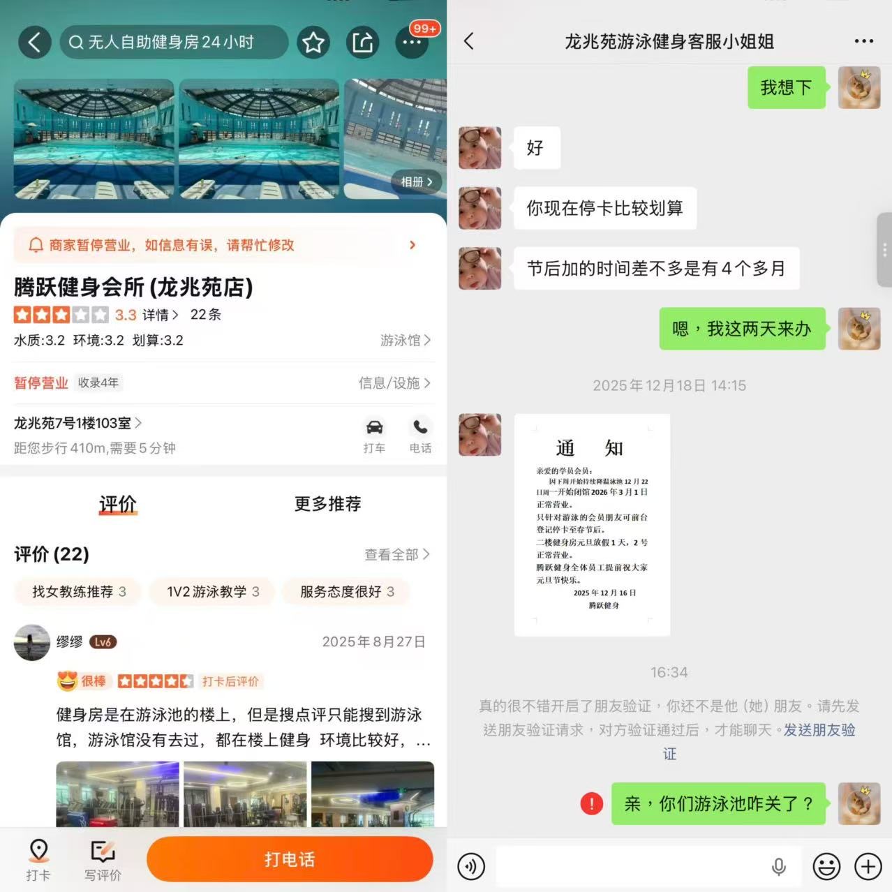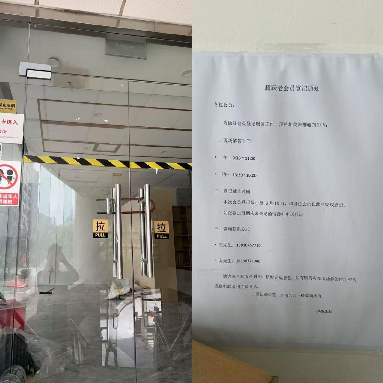 本人于2025年11月11日晚在腾跃健身办理了50次游泳健身卡,支付了1500元。销售人员于2025年12月18日通过微信通知该馆的游泳馆从12月22日起放假闭馆,2026年3月1日正常营业。2026年4月4日下午,前往该馆时发现一楼二楼空空荡荡并没有工作人员,二楼健身房也是大门紧闭。后通过了解才得知该馆老板跑路,联系原来的销售人员询问但被删除好友,身边有亲属有相同遭遇,希望相关部门介入讨回损失