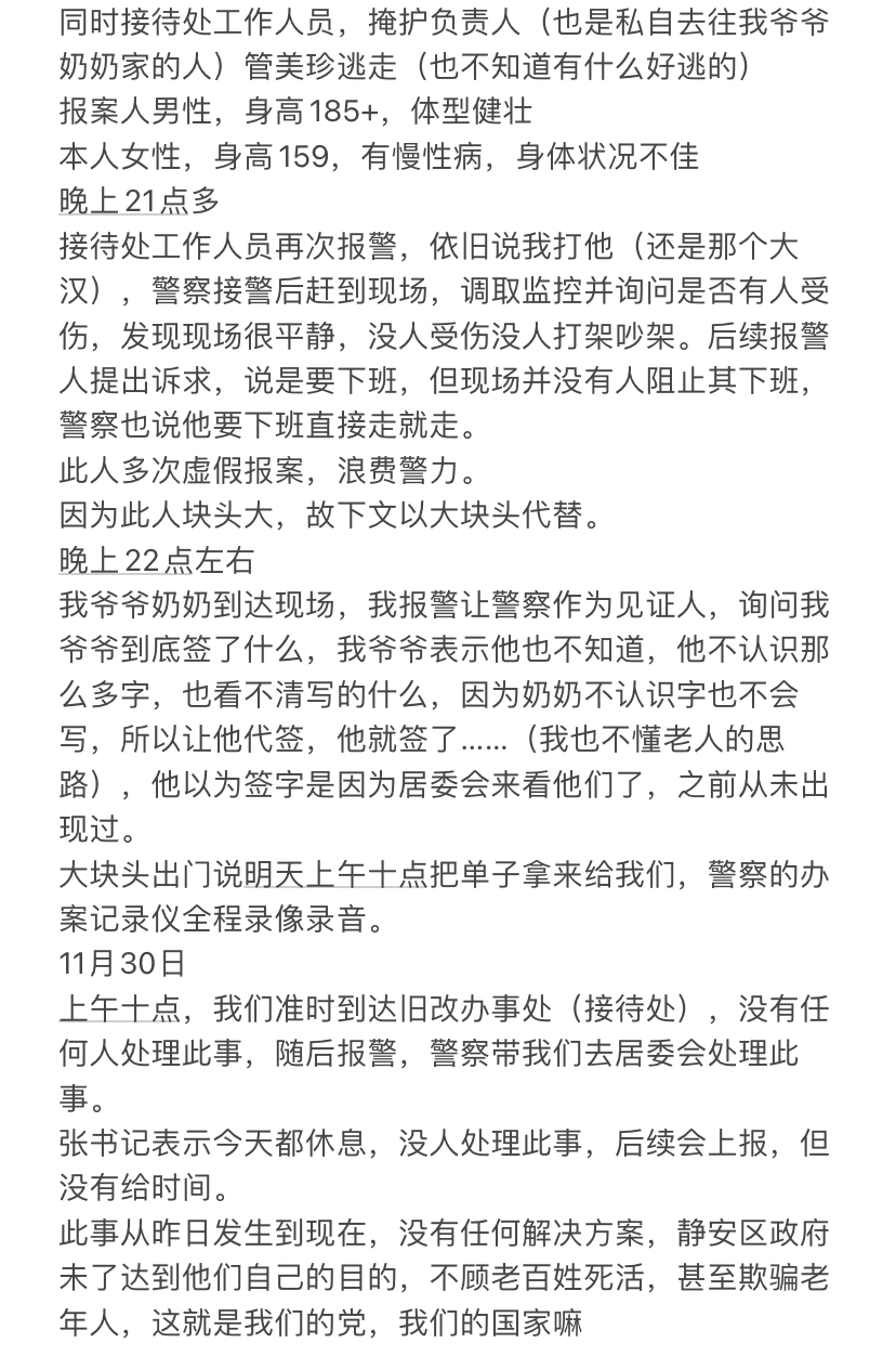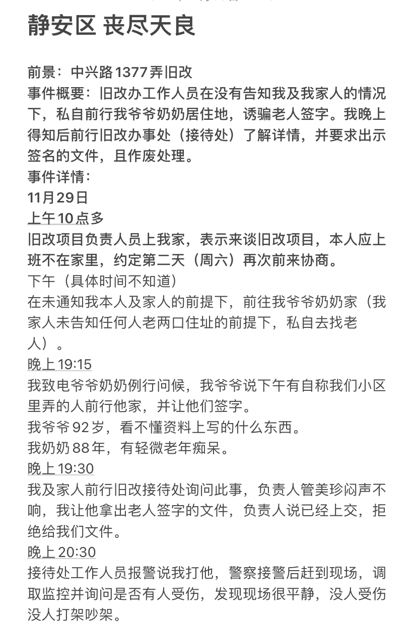 事件概要:旧改办工作人员在没有告知我及我家人的情况下,私自前行我爷爷奶奶居住地,诱骗老人签字。我晚上得知后前行旧改办事处(接待处)了解详情,并要求退还签名的文件。