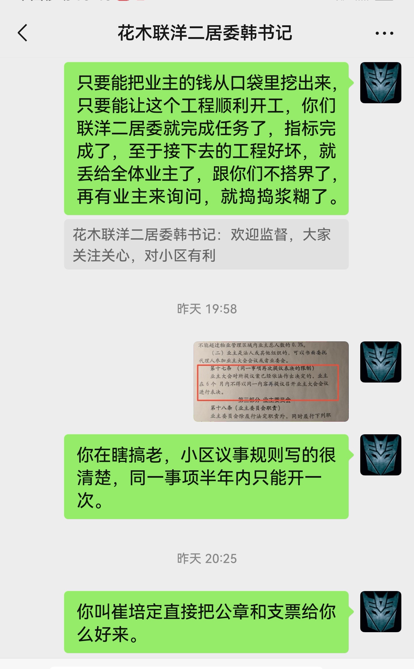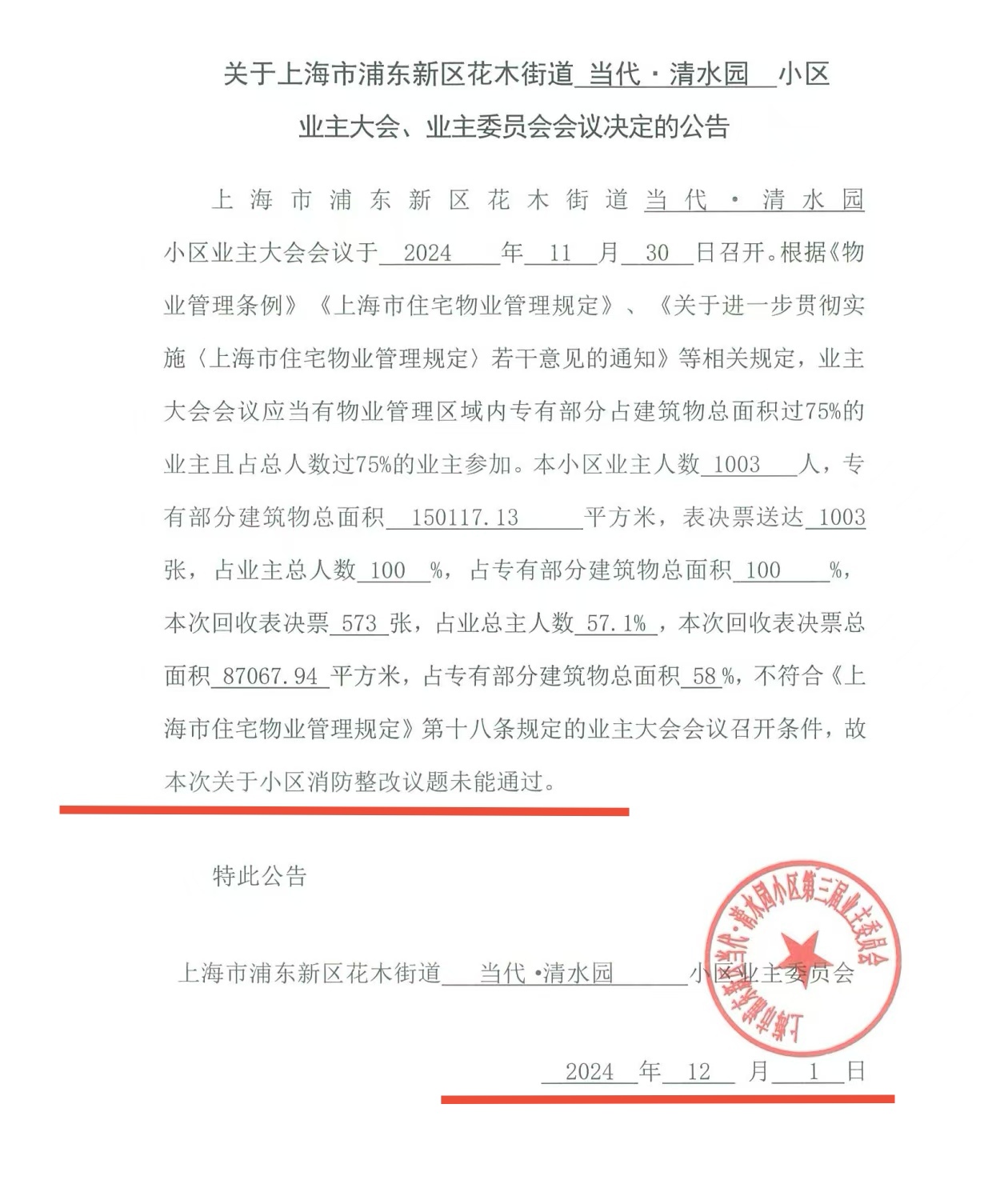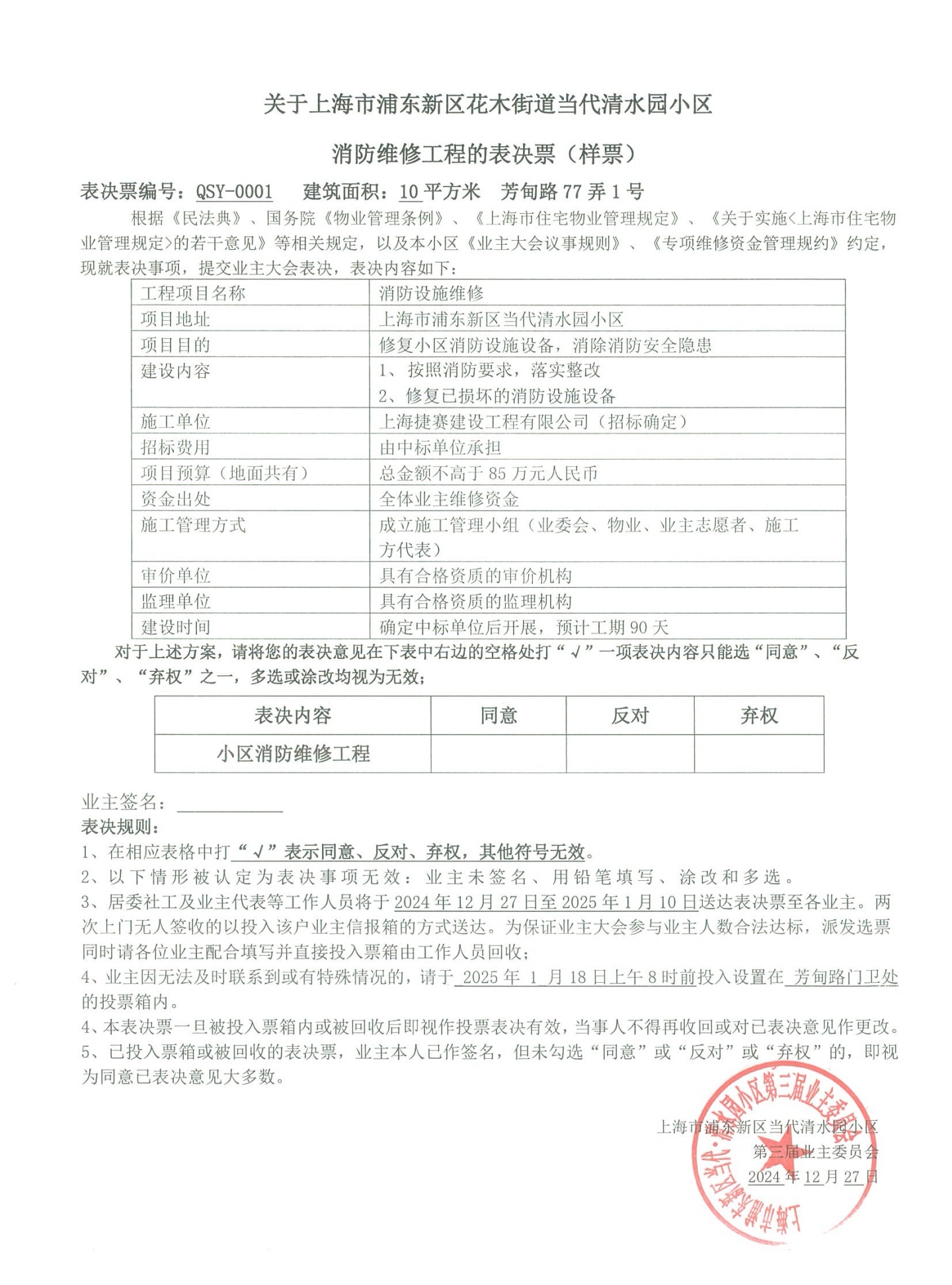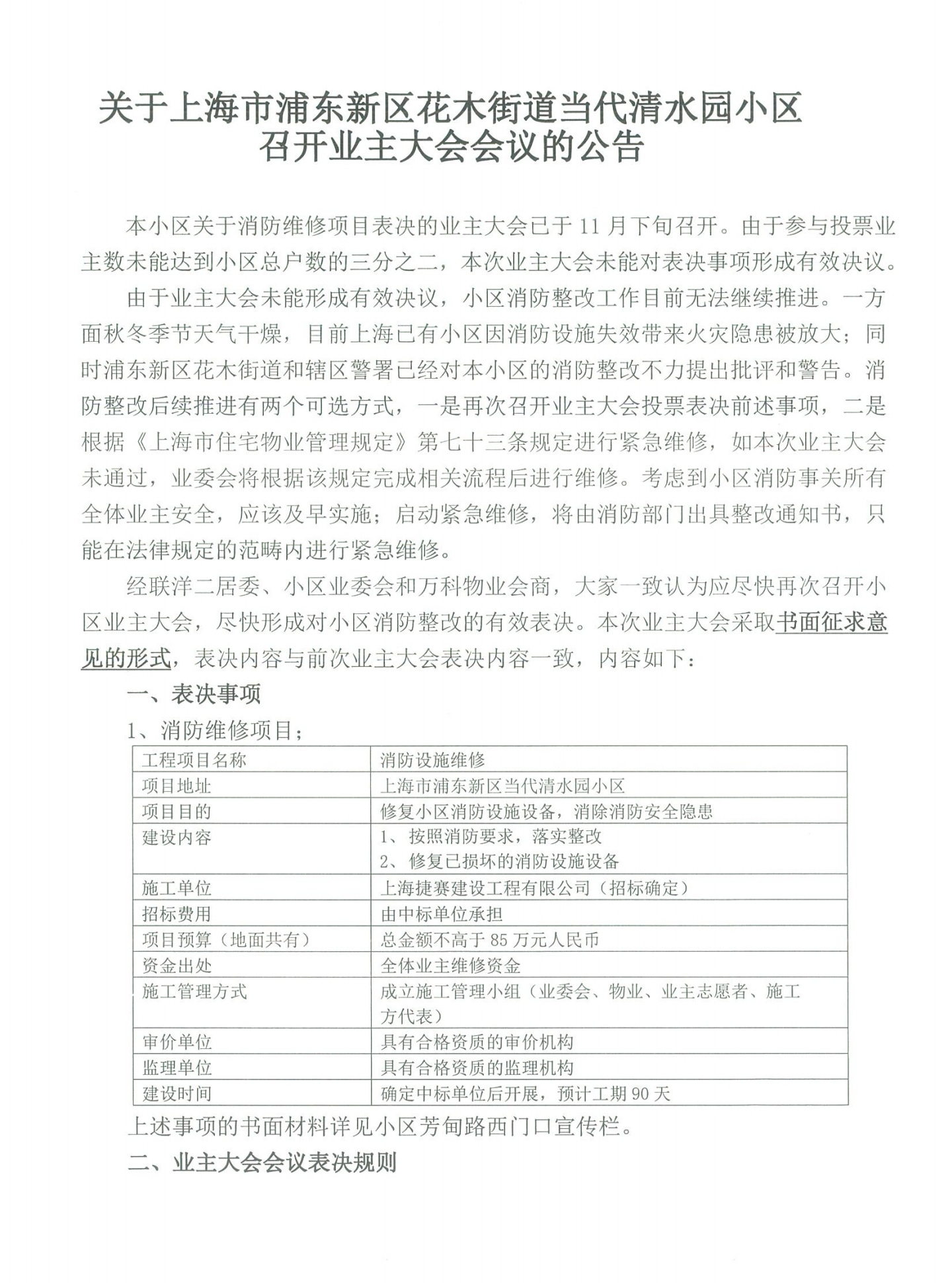 当代清水园小区于2024年11月30日已就是否需要消防设施整改召开业主大会,表决结果是未通过。而业委会与联洋二居委违反小区业主大会议事规则第17条“同一内容6个月内不得再次召开业主大会”的相关规定,强行于12月27日再次就消防设施整改召开业主大会,一副不将85万维修基金从业主口袋里挖出来誓不罢休的态势,居民微信询问居委韩书记也是置之不理,恳请电视台记者予以曝光。